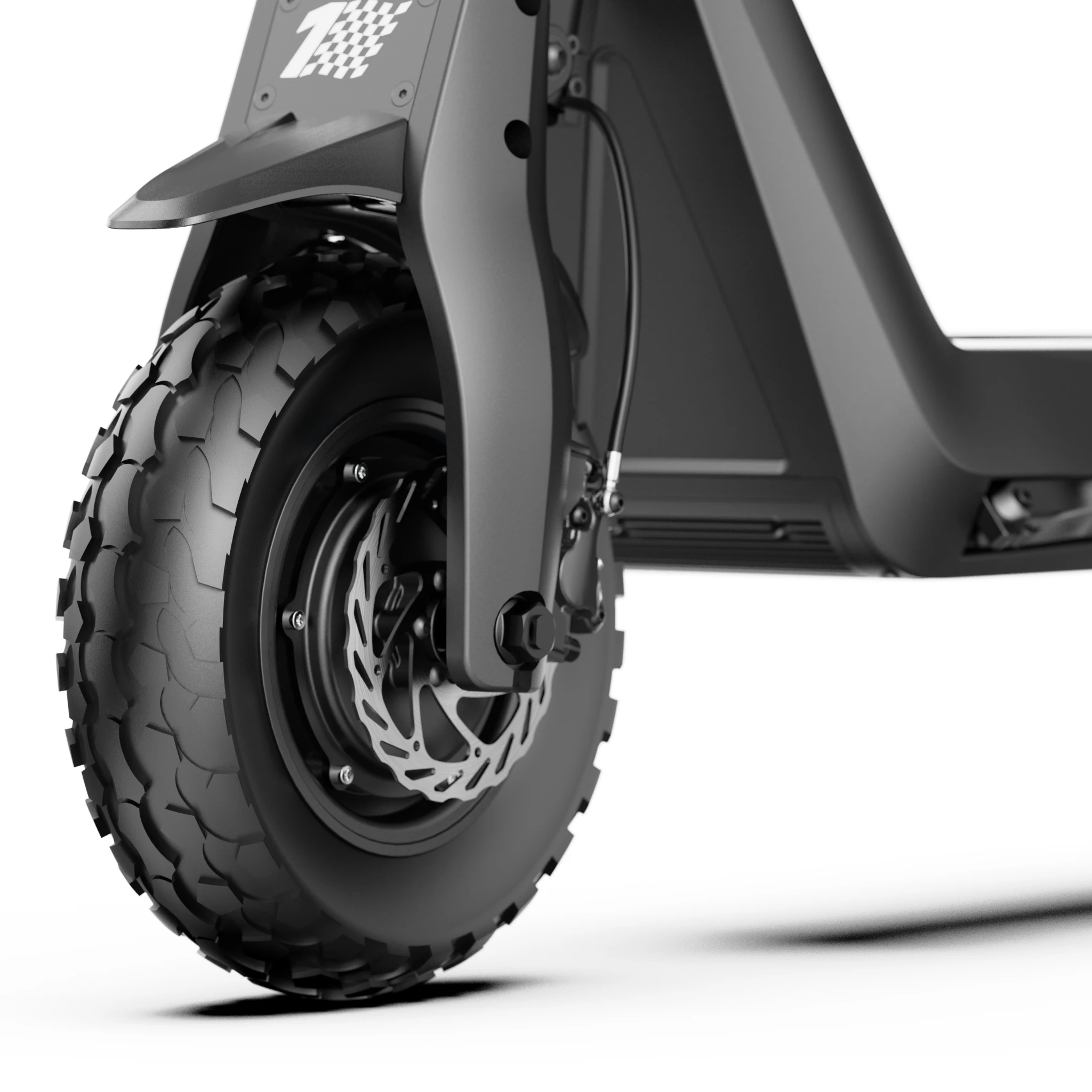 It features a 52 V 19.2 Ah removable battery with up to 50 km range and a 5-hour charging time. Equipped with large 12-inch CST tubeless hybrid tires and spring suspension on both wheels, it ensures a smooth ride on various terrains. Although it comes without a seat, the wide deck offers comfortable standing space.