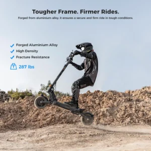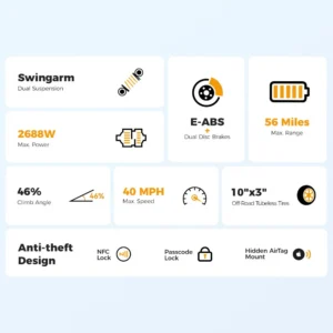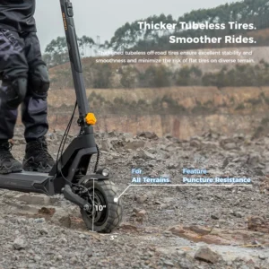 Vozači imaju koristi od stabilne platforme koju podupiru 10×3,0-inčne hibridne gume bez zračnice, odabrane zbog snažnog prianjanja i otpornosti na probijanje. Podesivi opružni ovjes sprijeda i straga osigurava bolju kontrolu na neravnim površinama, uz zadržavanje udobnosti tijekom duljih vožnji. Informacije o vožnji prikazuju se na 4,5-inčnom LCD zaslonu sa zaštitom lozinkom, koji omogućuje jasan pregled brzine, statusa baterije, odabranog načina vožnje i ključnih pokazatelja rada. Načini vožnje — eco, drive i sport — omogućuju prilagodbu performansi željenom stilu vožnje i terenu.